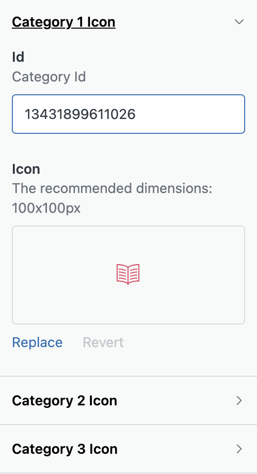 In the Id setting, enter the Id of the category for which you want to display the icon.