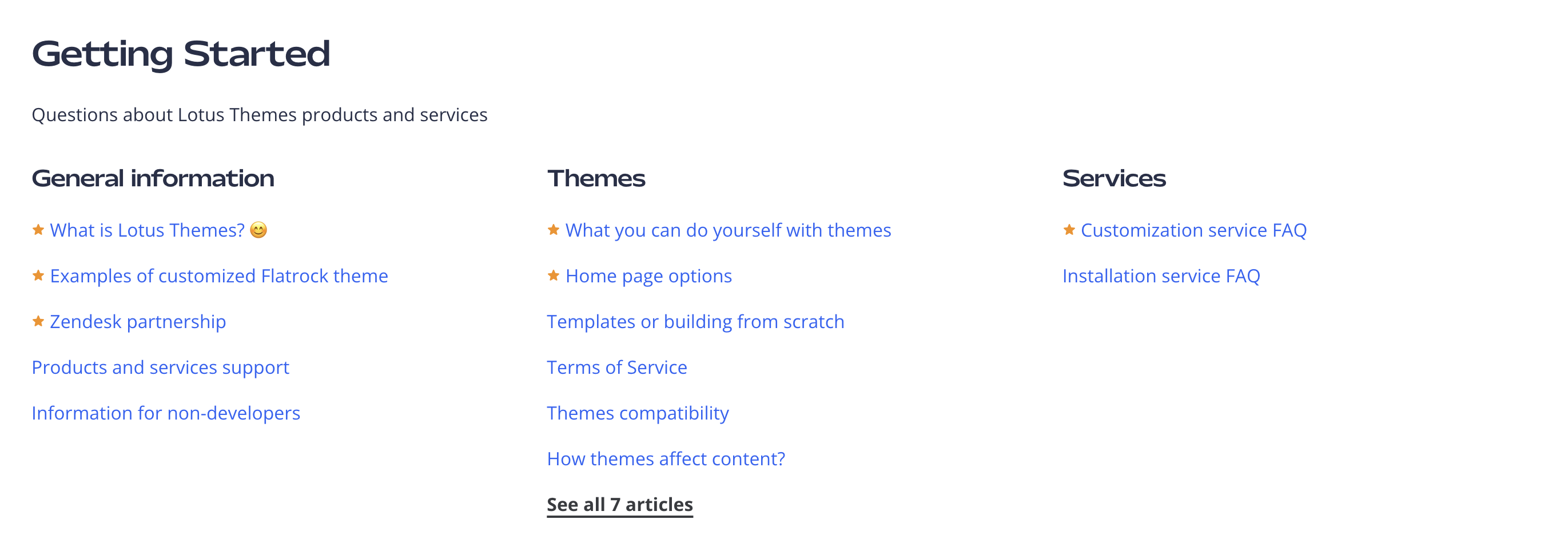 Our themes have a variety of different layout styles for displaying categories, sections, and/or articles in your help center.
